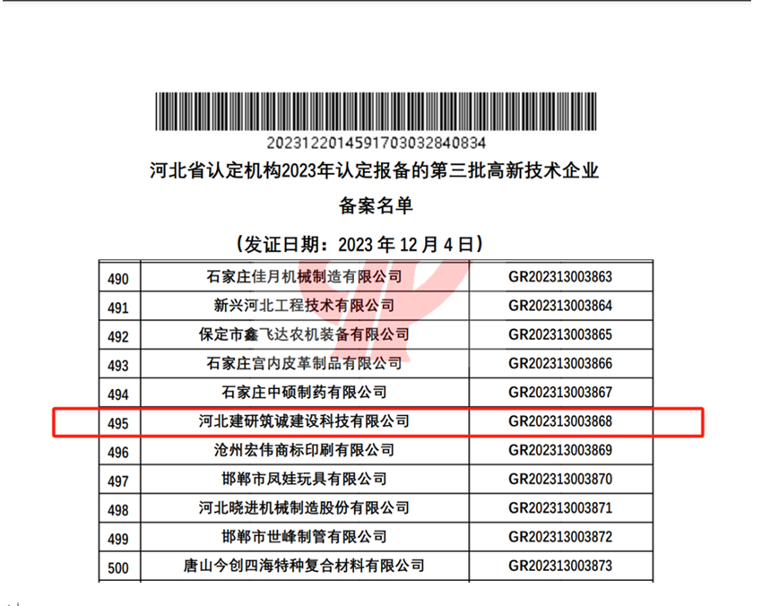 2023年12月20日,全國高新技術企業認定管理工作領導小組辦公室公示了河北省認定機構2023年認定報備的第三批高新技術企業備案名單,河北建研筑誠建設科技有限公司順利通過了國家高新技術企業認定(證書編號GR202313003868),標志著公司在科技創新的道路上又邁出了堅實的一步。
