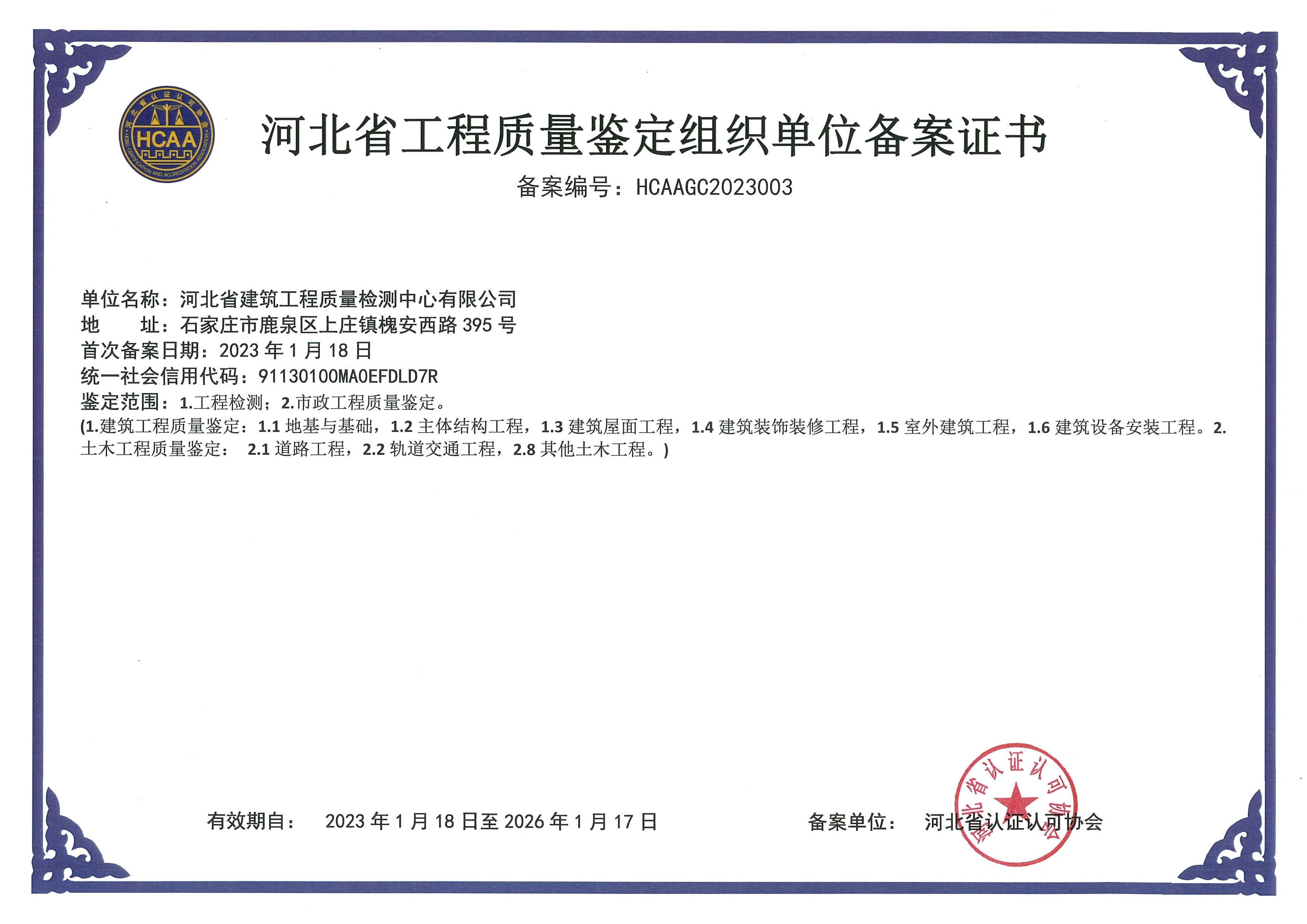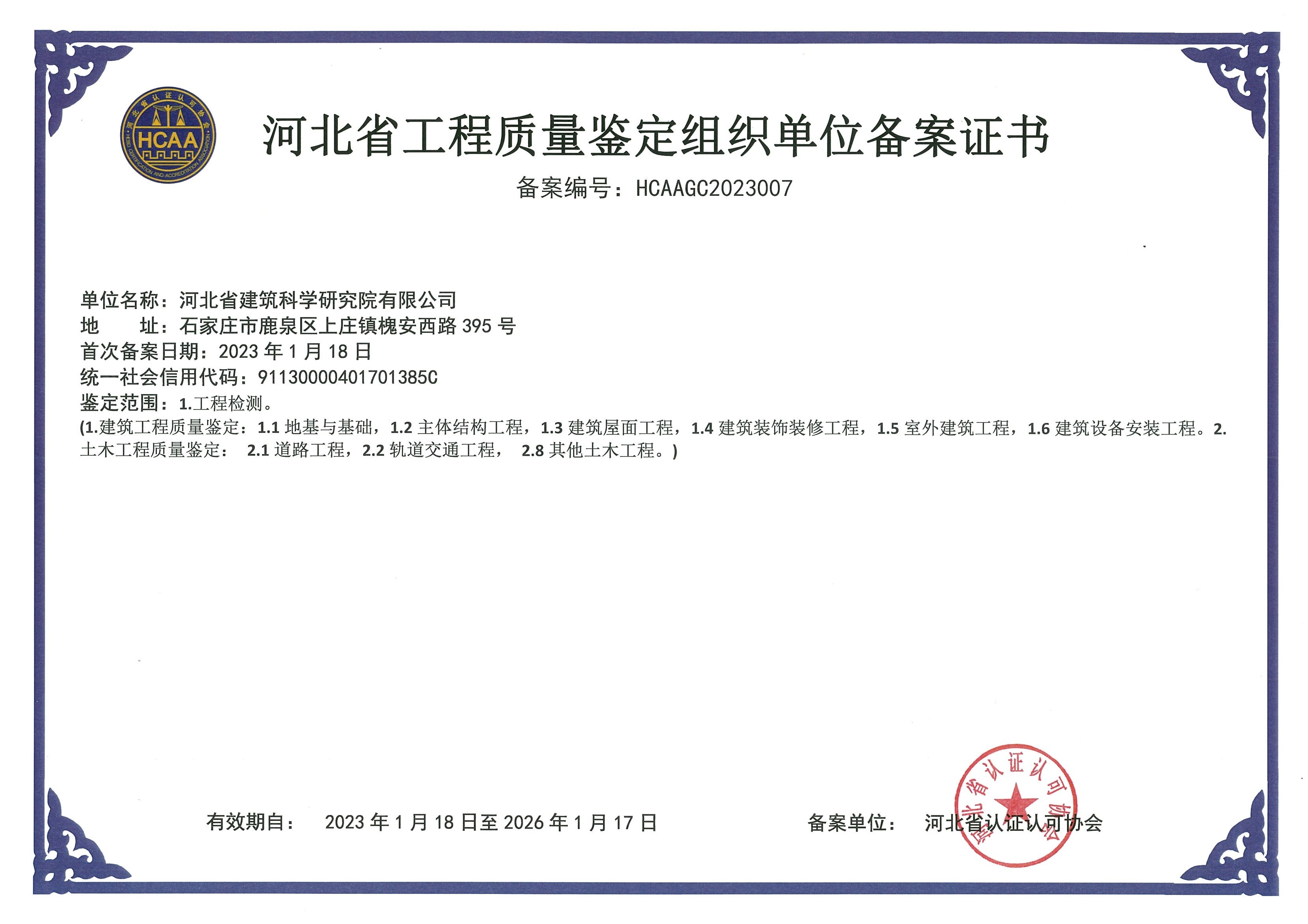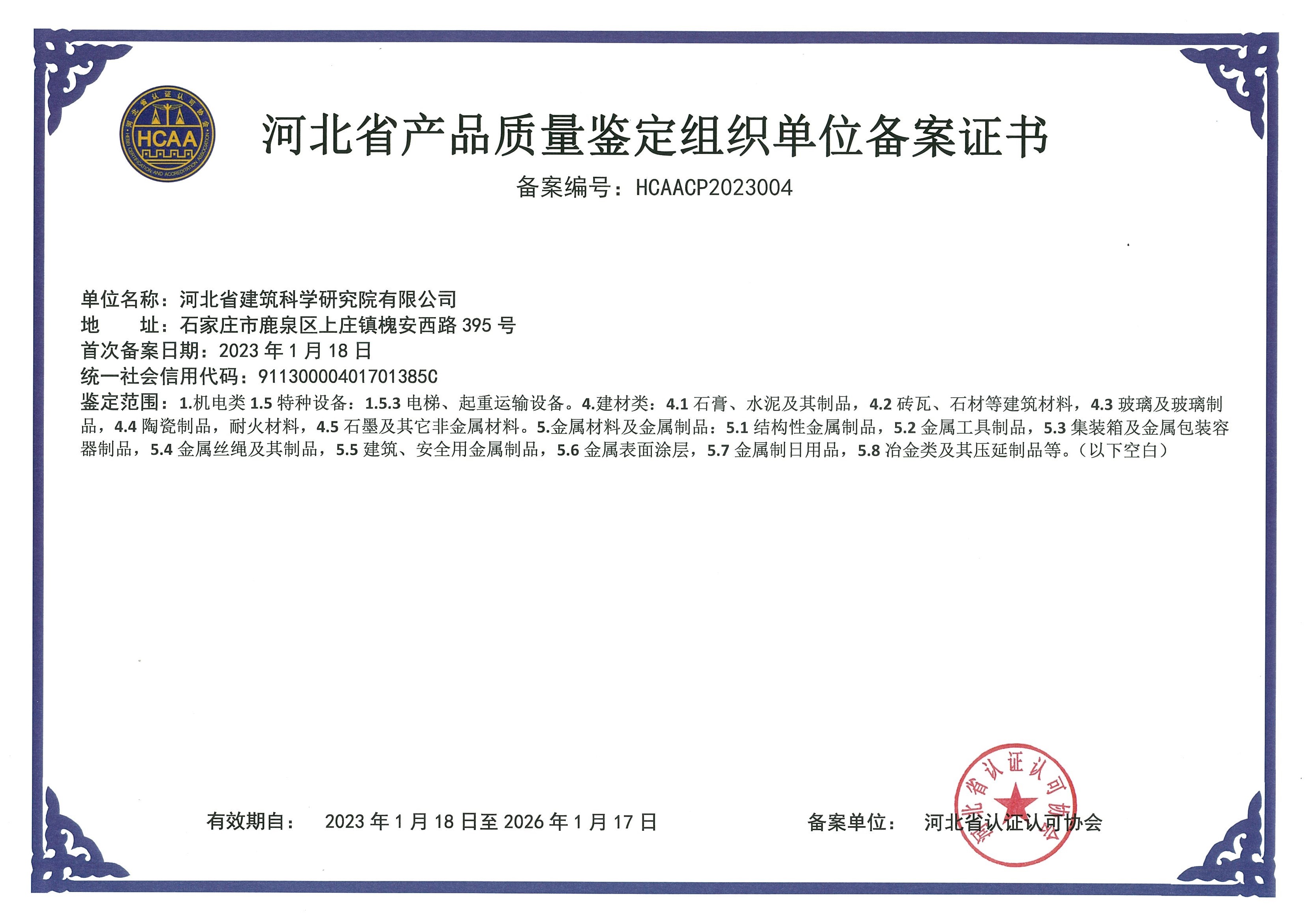 河北省建筑工程質(zhì)量檢測(cè)中心產(chǎn)品質(zhì)量鑒定組織單位備案證書1