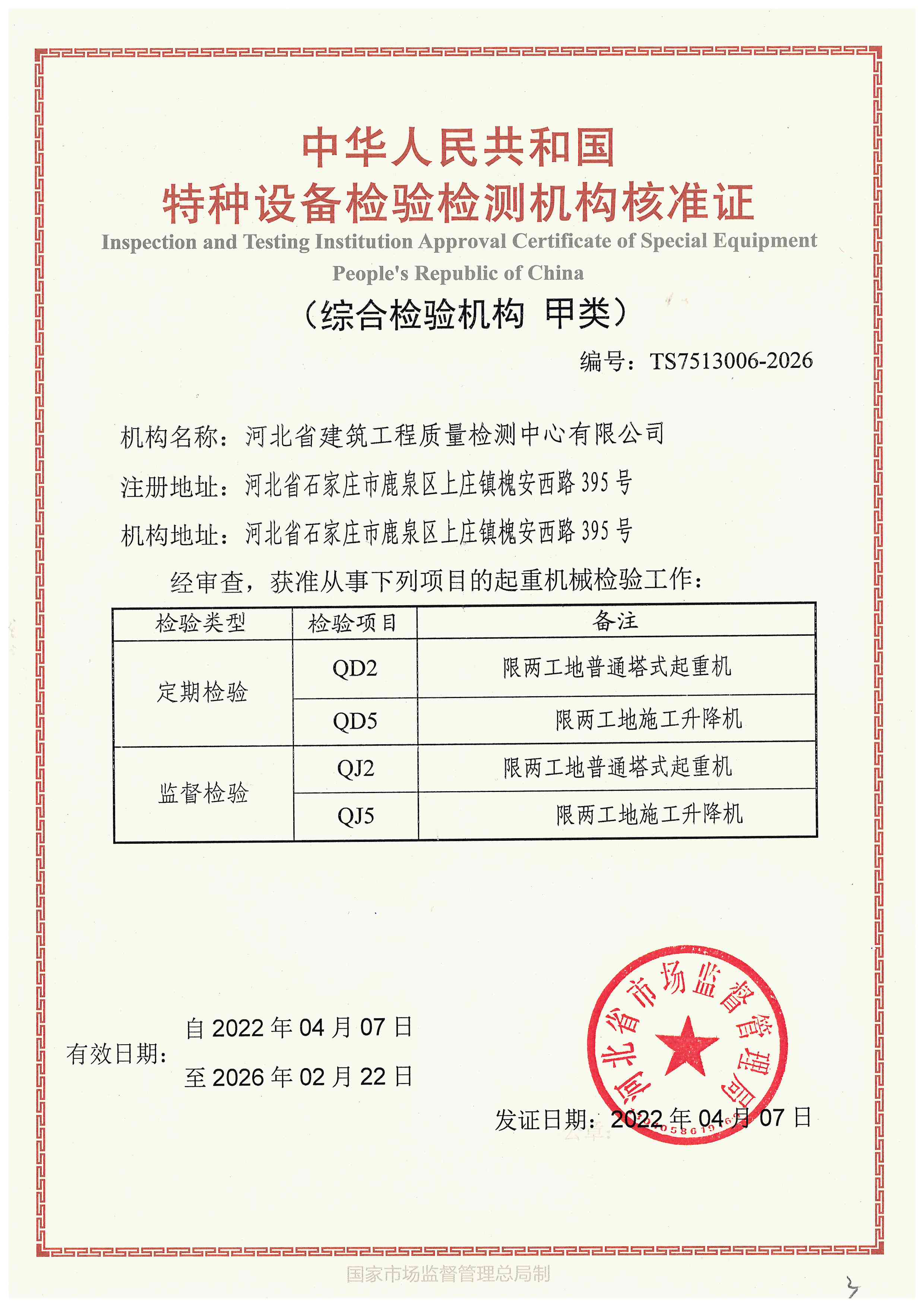 河北省建筑工程質(zhì)量檢測(cè)中心特種設(shè)備檢驗(yàn)檢測(cè)機(jī)構(gòu)核準(zhǔn)證